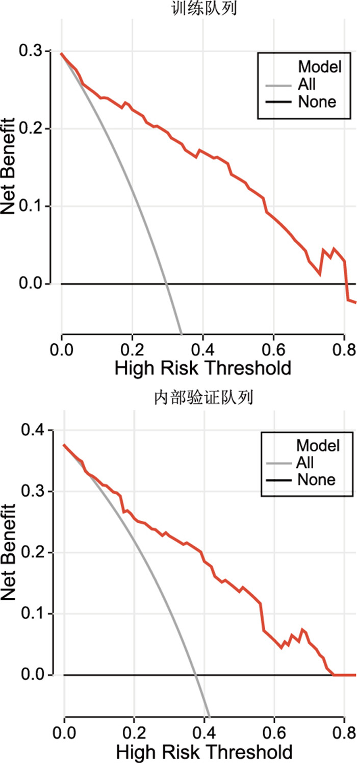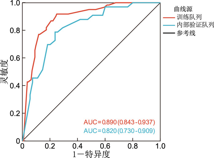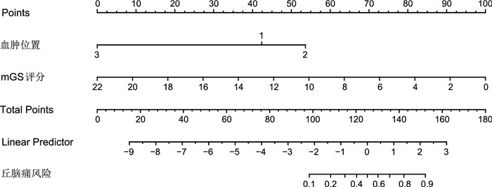Objective  The occurrence of thalamic pain significantly impacts patients' quality of life. Early identification of patients at risk for developing thalamic pain can facilitate timely clinical interventions and decision-making to alleviate patient suffering. This study aims to develop and validate a nomogram model to predict the occurrence of thalamic pain following spontaneous thalamic hemorrhage.  Methods  A total of 294 patients with spontaneous thalamic hemorrhage were retrospectively included from the First Affiliated Hospital of Harbin Medical University between June 2021 and December 2022. Patients were randomly assigned to the training cohort (n=206) and internal validation cohort (n=88) in a 7∶3 ratio using computer-generated random numbers, with the training cohort used for model development and the internal validation cohort for validation. Feature variables most suitable for model construction were selected using the least absolute shrinkage and selection operator (LASSO) algorithm. Subsequently, the selected features were incorporated into a multivariable logistic regression model to develop the nomogram. The performance of the model was assessed in the training and internal validation cohorts using the area under the receiver operating characteristic curve, and decision curve analysis.  Results  A total of 294 patients were included in this study, of whom 94 cases (31.97%) developed thalamic pain, while 200 cases (68.03%) did not. The LASSO-logistic regression analysis in the training cohort identified two independent predictive factors: hematoma location (P < 0.001) and modified Graeb score (mGS) score (P < 0.001). These predictors were incorporated into the nomogram prediction model. ROC curve analysis demonstrated high predictive performance of the nomogram model (training cohort AUC: 0.890; internal validation cohort AUC: 0.820). Decision curve analyses further indicated that the model has strong predictive ability for the occurrence of thalamic pain following spontaneous thalamic hemorrhage.  Conclusion  This study develops a nomogram model to assess the risk of thalamic pain in individual patients following spontaneous thalamic hemorrhage, demonstrating excellent predictive performance. The model provides clinicians with a practical tool to guide treatment decisions for high-risk patients.