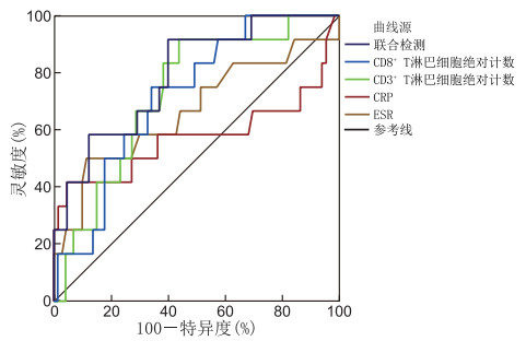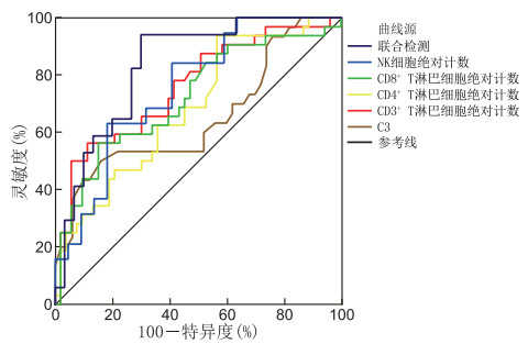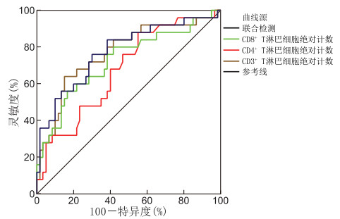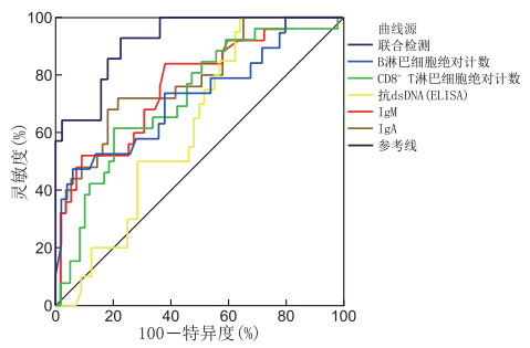 Objective   To explore the correlation between changes in lymphocyte subsets in systemic lupus erythematosus (SLE) patients and disease activity, as well as the value in predicting different system impairments, in order to provide laboratory indicators for clinical assessment of SLE disease activity and system impairments.   Methods   A total of 85 SLE patients and 80 healthy controls admitted to People' s Hospital Affiliated to Fujian University of Traditional Chinese Medicine from March 2023 to June 2024 were enrolled. The SLE patients were classified based on disease activity and damage to different systems. The counts of T lymphocyte subsets, B lymphocytes, and NK cells were measured. Correlation analysis and logistic regression analysis were used to explore the correlation between these parameters and SLE disease activity indicators and their predictive value for damage to different systems.   Results   The absolute counts of CD3+, CD4+, CD8+ T lymphocytes, B lymphocytes, and NK cells in SLE patients and the disease activity group were all lower than those in the healthy control group and the disease inactivity group. The absolute counts of CD3+, CD4+, and CD8+ T lymphocytes in the SLE renal lesion, hematological system involvement, arthritis, and serositis groups were all lower than those in the groups without corresponding system damage. The absolute count of NK cells was decreased in the renal lesion group. The absolute counts of CD3+ and CD8+ T lymphocytes were decreased in the infection group (P < 0.05). The combined detection of erythrocyte sedimentation rate (ESR), anti-dsDNA antibody, absolute counts of CD3+, CD4+, and CD8+ T lymphocytes, NK cells, and B lymphocytes had an AUC of 0.882 for predicting SLE disease activity. The combined detection of complement (C)3, absolute counts of CD3+, CD4+, and CD8+ T lymphocytes, and NK cells had an AUC of 0.833 for predicting SLE renal lesions.   Conclusion   Lymphocyte subsets are abnormal in SLE patients with disease activity, damage to different systems, and concomitant infections, etc. Combined detection of lymphocyte subsets and SLE disease activity indicators can assess SLE disease activity and predict damage to different systems.