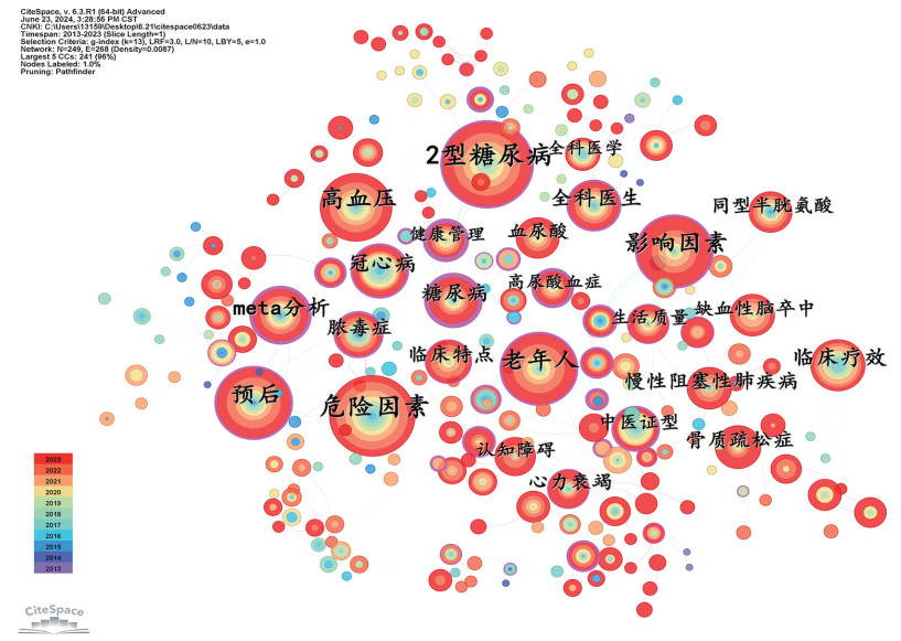 Objective  China's general practice health services and general practice education are developing rapidly. To summarize the relevant graduate theses of general practice through bibliometric analysis and clarify the research hotspots and trends, reflecting the existing problems, and providing reference for the selection of topics for future graduate students in General Medicine.  Methods  Graduate theses of general practice from 2013 to 2023 was searched for in the China National Knowledge Infrastructure (CNKI) and Wanfang Database. CiteSpace software was used to visually analyze the number of publications, degree type, institutions, keywords, etc.  Results  Ultimately 2 475 documents were included. There were relatively few graduate theses in general practice from 2013 to 2014, but it entered a rapid growth stage since 2015. A total of 105 universities participated in this study. There was a large gap in professional development among institutions, and there was little cooperation. According to the keyword visualization analysis, it was found that the top 10 high-frequency keywords were type 2 diabetes, risk factors, influencing factors, prognosis, the elderly, hypertension, clinical efficacy, meta-analysis, coronary heart disease, general practitioners; and diabetes mellitus, health management, and health education had the highest intermediary centrality; the keywords clustered together to form 9 modules, which could be focused on 4 topics, chronic disease management, epidemiology, clinical diagnosis and treatment, and discipline construction. The research hotspots kept changing from 2013 to 2023, and the keyword with the highest emergence intensity during this period was traditional Chinese medicine syndrome type. The research hotspot focused on diseases, but there were more explorations on the disease diagnosis and treatment; after 2018, insomnia, depression, health management and obesity became the most prominent keywords.  Conclusion  In recent years, the research hotspots of graduate theses in general medicine mainly focus on chronic disease management, epidemiology, clinical diagnosis and treatment and discipline construction, and insomnia, depression, health management and obesity may become the future research trend. However, there is still a big gap compared with domestic and international journals in the field of general medicine. Future research should have an international perspective, root general practice research in our grassroots and communities, promote the development of general practice and a healthy China.