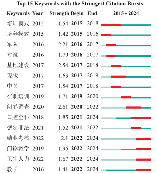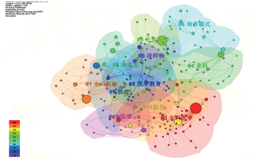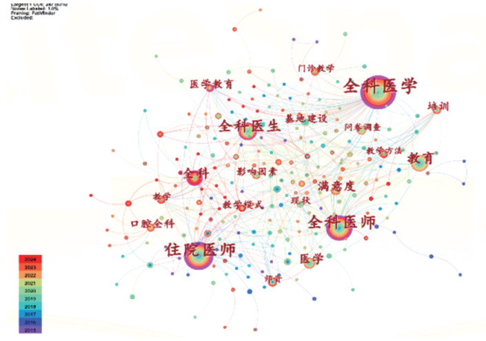 Objective  Based on the visual analysis of literature data related to the field of standardized training of general practice residents in China, to explore the current situation, hotspots, and development trend of the research on standardized training of general practice residents in China.  Methods  By searching the literature related to standardized training of general practice residents published in the China National Knowledge Infrastructure (CNKI) database from January 2015 to October 2024, and using the bibliometric software CiteSpace to visualize and analyze the year of publication, keyword co-occurrence, clustering, and emergence of the literature.  Results  A total of 627 literatures were included. The research on standardized training of general practice residents in China started late, and the number of research publications in this field fluctuates but was generally in a good development trend of rising and stability. The number of publications in 2015-2016 was relatively small, with a total of 65 articles, accounting for 10.36%; the number of publications in 2017-2020 grew rapidly, with a total of 281 articles, accounting for 44.82%; the number of publications in 2021-2024 was relatively stable and had a slight downward trend, totaling 281 articles, accounting for 44.82%. The keywords and their centrality and clustering scale showed that general practice, residency, general practitioner, and general physicians were the research hotspots. The analysis of keyword emergence showed that the initial period mainly focuses on the research of training mode and training status, while the current research was more in-depth, and the final assessment, outpatient teaching, satisfaction, mentorship, questionnaire survey, Delphi method and so on become the hot spots of research in this field and the future research direction.  Conclusion  In the future, we should strengthen in-depth research on the diversification of research topics and methods in the field of standardized training for general practice residents, combine multiple research methods such as questionnaire surveys and the Delphi method, and further promote the innovative development of research topics such as improving the construction of general dentistry, standardizing general practice outpatient teaching, and improving the pass rate of final examinations.